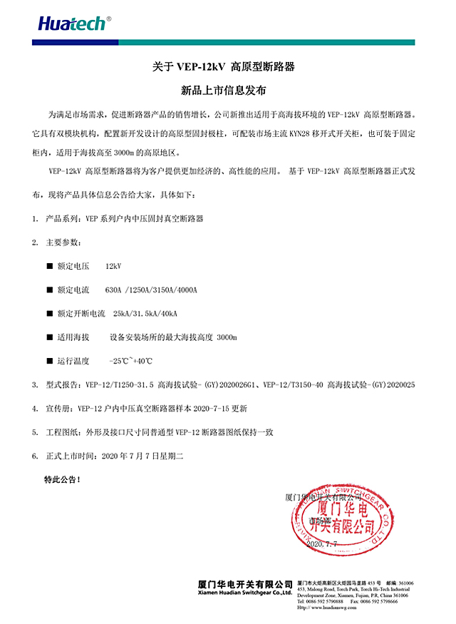 近日,厦门华电开关有限公司全新推出VEP-12kV 高原型中压固封式真空断路器。