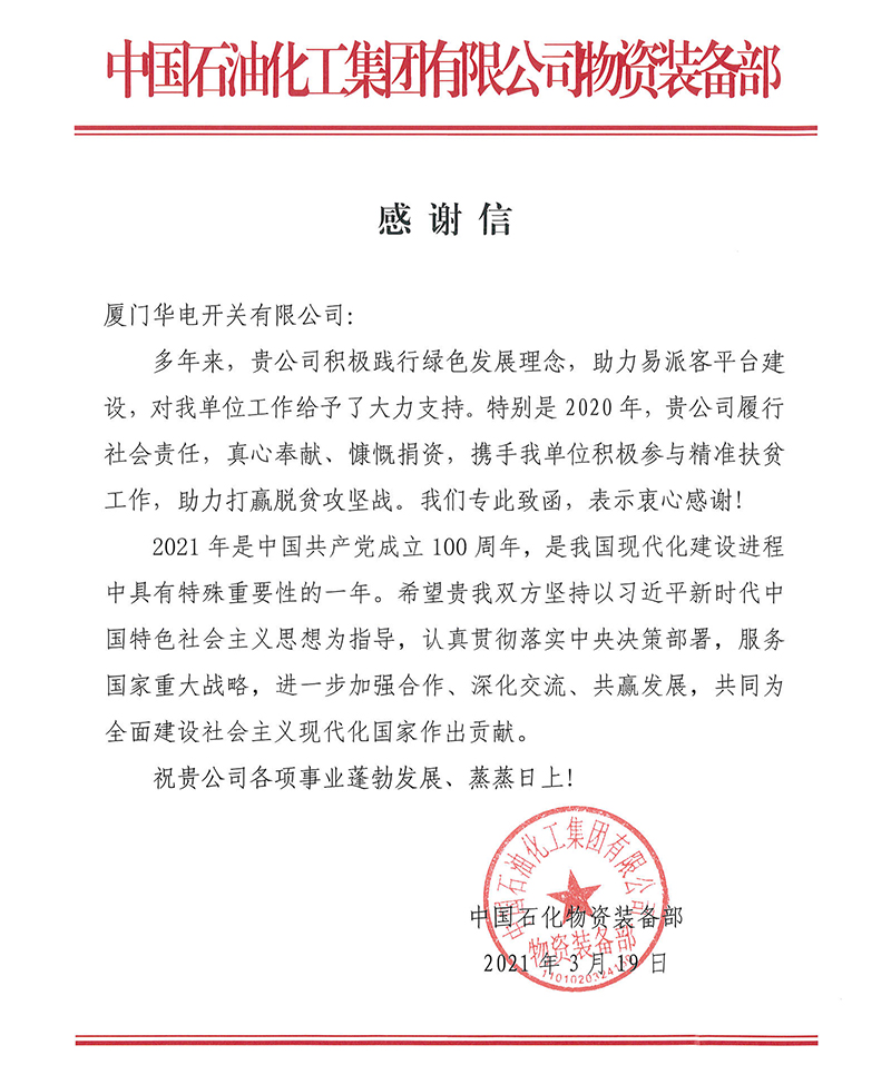 日前,中国石油化工集团有限公司物资装备部向厦门华电开关有限公司发来感谢信,并授予荣誉证书,感谢厦门华电开关有限公司多年来,积极践行绿色发展理念,并对其单位工作给予的大力支持。